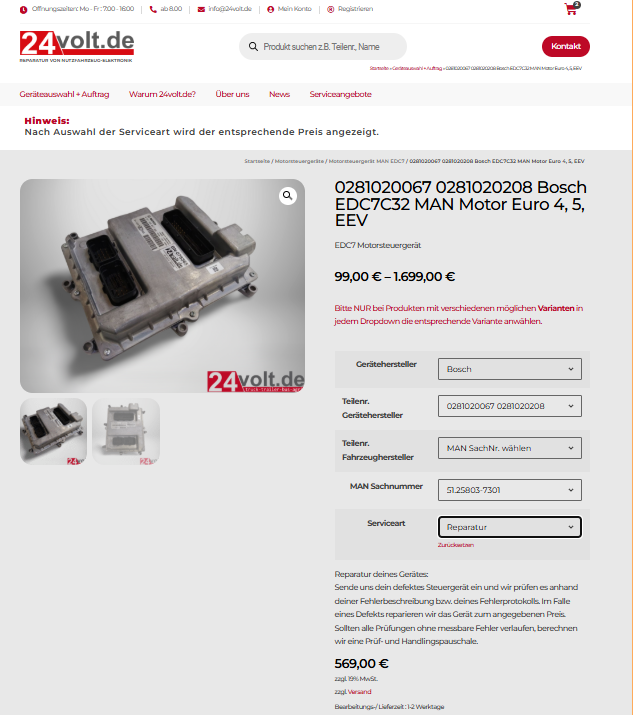 - Übersichtliche Auswahl: Im Menüpunkt Geräteauswahl + Auftrag findet Ihr das passende Produkt, wählt die gewünschte Serviceart als Variante aus und legt alles bequem in den Warenkorb.